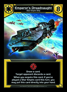 There are a number of exciting new mechanics introduced in this set. Colony Wars introduces cards such as the Emperor’s Dreadnaught that can be purchased from the Trade Row and under certain conditions, can immediately come into play or be put into a player’s hand. Regular Star Realms players will notice that this greatly accelerates the speed of play, but also requires an equal and opposite strategic shift to account for an opponent’s new found advantage.
