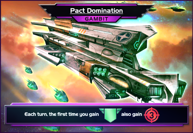 Pact comes with an 8-cost ship to shuffle into the Market Deck at the outset of the game, two gambits to set aside for use during the game, and a 12-card starting deck. You begin the game with 66 authority, instead of the normal 50, and a hand size of 6 cards, instead of the normal 5. You will start with 3 if you are the first player. Let’s examine each card you bring to the game: