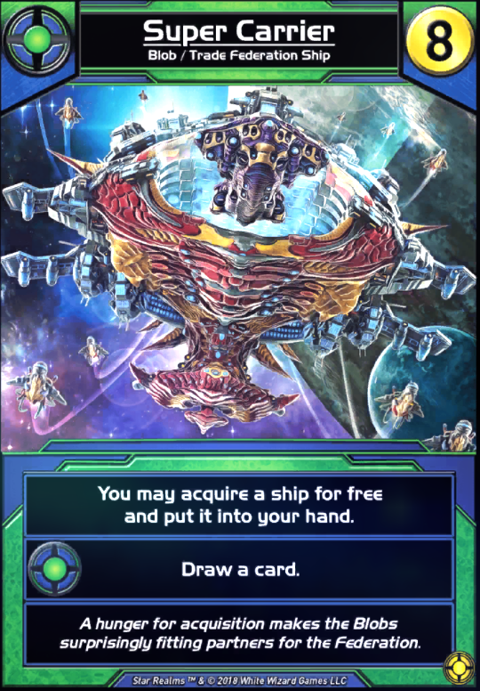 Super Carrier: This card is shuffled into trade deck before game. Certainly fun and powerful, this impactful bomb is often a liability. If you cannot purchase it, punch it as soon as possible.