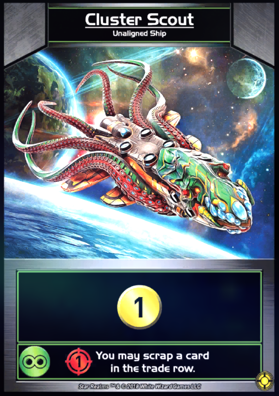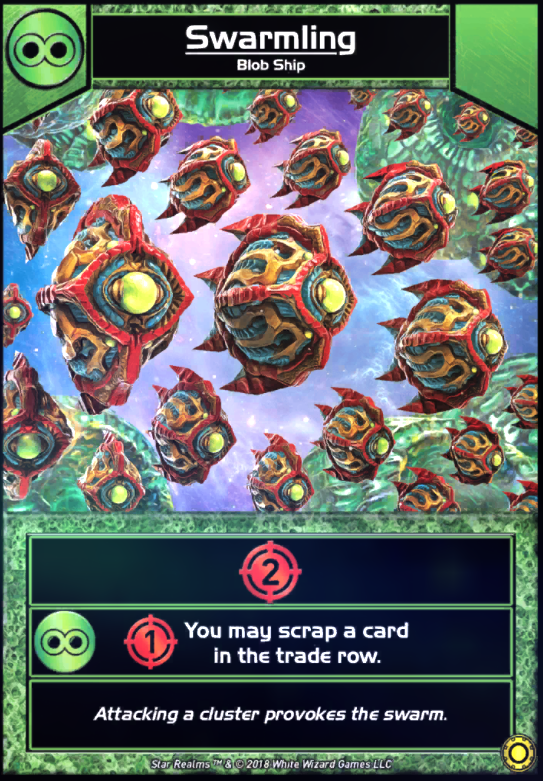 Swarmling: Our other puncher. Like the Cluster Scout, activate to get the damage whether or not you choose to refresh the trade row. We will focus on row manipulation strategy shortly.