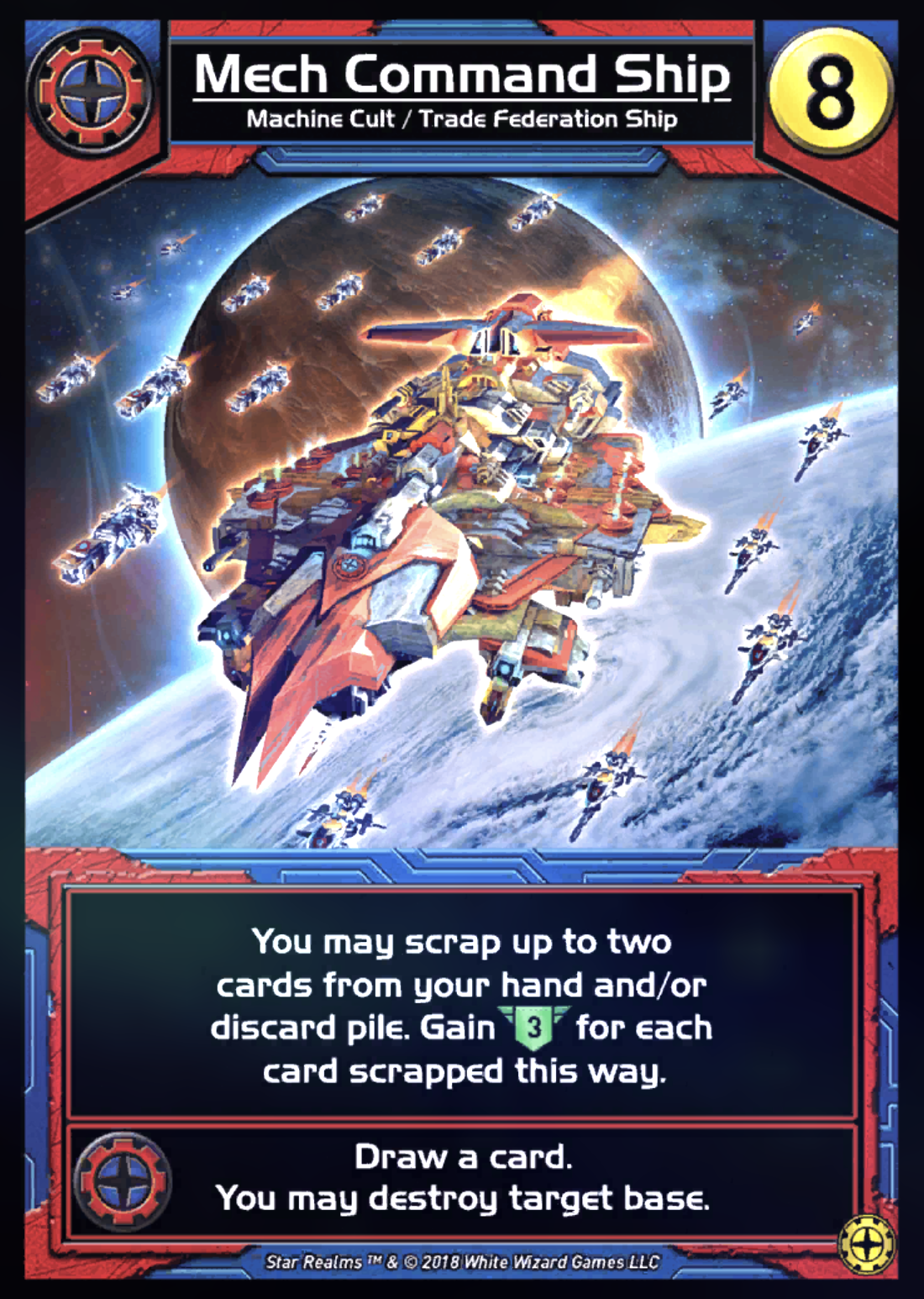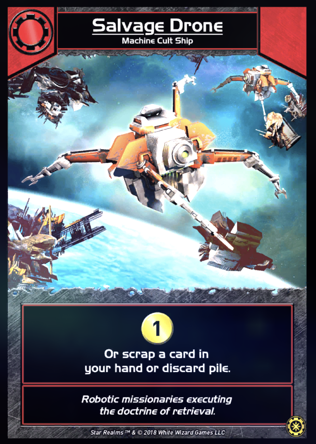 To give an example for #2, there will be cases where you know you have a Repair Bot or something like that coming up in your next hand, but there’s only one Scout in your hand to scrap with your Battle Bot now, and none in your discard. You may as well get back that Scout even if you don’t want or need it, because you’ll be able to scrap it for good next turn.You could also scrap something else with the Repair Bot and get that back (a #1-scenario), but remember you can only use Coalition Efficiency once a turn. If you had another scrapper in the hand with the Repair Bot, you’ll regret not having gained 5 the turn prior. This comes up more often when you have a lot of scrap – try to not let any go to waste.