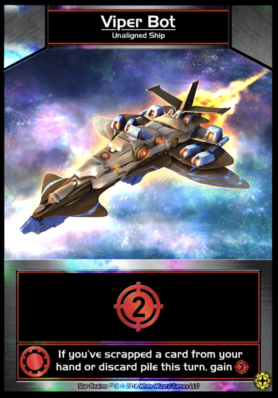 On top of that, a lot of her plans rely on certain conditions to be met outside of the trade row cooperating. Viper Bot is great at helping rush your opponent IF you always draw it with a scrapper. Frontier Tug is fantastic at setting up base-walls IF you can ally it (and draw it with trade to buy bases).