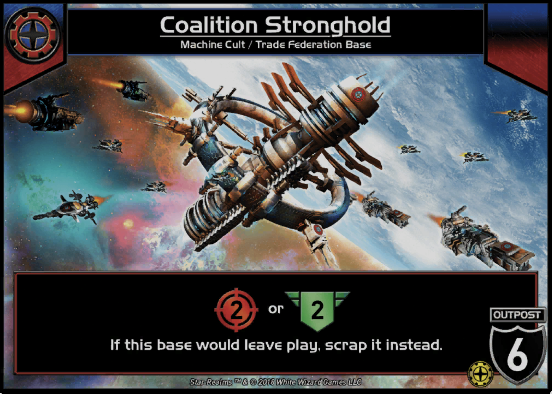 (In case you haven’t seen it yet: it’s a 6 defense, Cult-Federation dual-faction Outpost, that can gain you 2 authority or 2 damage each turn it sits in play – not good, but excellent with Missions!)