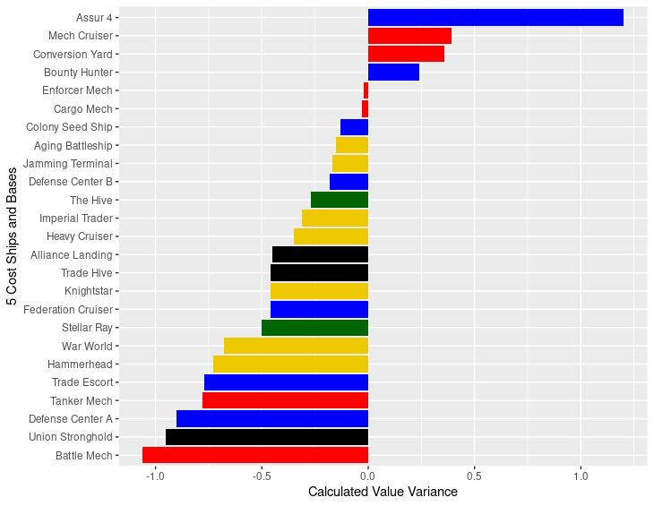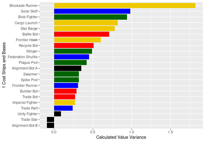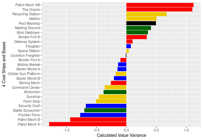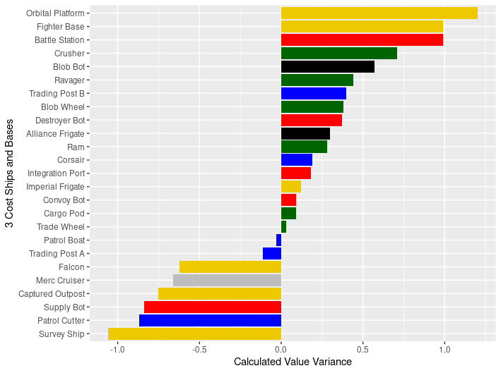The surprises to me on this list are the 3-cost bases: Orbital Platform, Fighter Base and Battle Station. Battle Station and Fighter Base don’t often jump of the screen to me as great values as 3-cost, but when the model says that a 5-butt outpost is worth 3.4 in card cost all by itself, then it make sense that those 5-butt outposts which cost 3 and bring additional abilities would make the list.